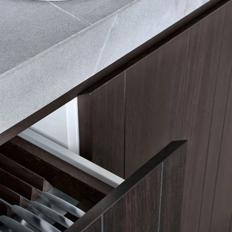 Bucataria Artex are un design contemporan si o estetica naturala, in acord cu principiile ergonomice indelung studiate de Poliform. Suprafete ample si riguroase, alaturi de liniile curate, subliniaza calitatea inalta a materialelor. Blatul din quartz subliniaza linia contemporana a ansamblului, iar fronturile frezate la 45 de grade inlocuiesc manerele ce ar fi incarcat suprafata curata a mobilierului.