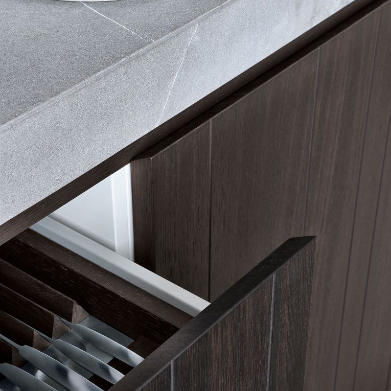 Bucataria Artex are un design contemporan si o estetica naturala, in acord cu principiile ergonomice indelung studiate de Poliform. Suprafete ample si riguroase, alaturi de liniile curate, subliniaza calitatea inalta a materialelor. Blatul din quartz subliniaza linia contemporana a ansamblului, iar fronturile frezate la 45 de grade inlocuiesc manerele ce ar fi incarcat suprafata curata a mobilierului.