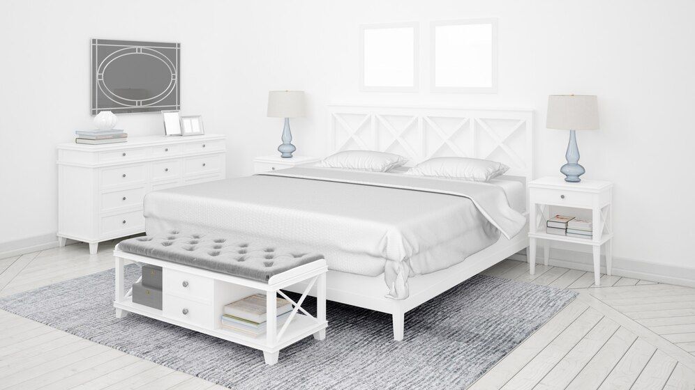 Pat: Un pat alb este o piesă centrală elegantă și versatilă. Se potrivește cu diverse lenjerii de pat și accesorii.