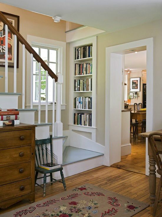 Spatiul de sub scara este intotdeauna un loc a carui amenajare dispune de o varietate de posibilitati. Aici este folosit intr-un mod util si estetic, cu un divan si o bliblioteca incastrata in peretele scarii, valorificand astfel un spatiu care ar fi fost dificil de folosit cu o mobila clasica.