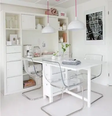 Mobilierul transparent scaunele din plexiglas completeaza placut piesele albe din camera