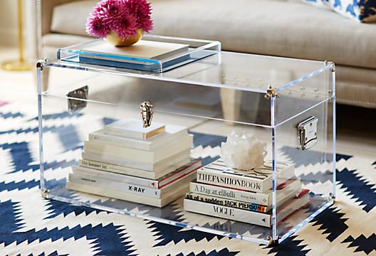 Mobilierul transparent in forma unui cufar folosit pe post de masuta de cafea perfect integrabil intr-un saptiu mic