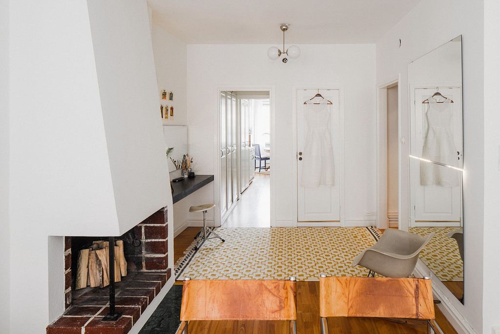 Creand micicentre de interes, veti inlatura impresia de lungime a camerei. In cazul amenajarii noastre, avem o zona de living impreuna cu un pat pentru dormit, delimitata printr-un covor si doua scaune, apoi o mini-zona de trecere cu un semineu si scaun, apoi din nou un spatiu dedicat unui birou, separat la randul lui printr-un alt fel de covor.