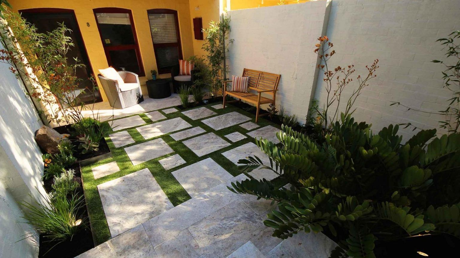 Placi de travertin imbinate cu gazon