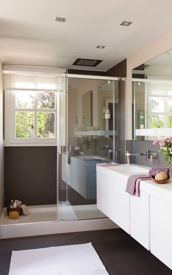 De obicei, impartim baia cu familia, partenerul/partenera. Si acest lucru uneori ne frustreza pentru ca fie nu avem loc suficient, fie nu gasim spatiul pentru a ne depozita (toate) lucrurile personale. Daca sunteti pe punctul de a renova baia, luati in calcul aceasta optiune: montarea a doua chiuvete si a doua oglinzi sau a uneia mari care sa cuprinda intreg peretele cu lavoarul.