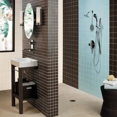 Tonuri calde de culori precum un bleu in asociere cu o gresie maro vor fi o combinatie potrivita pentru baia ta.