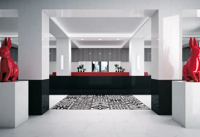 Efect deosebit printr-un motiv de placi ceramice folosite si pe perete. Placile de gresie de pe podea completeaza armonios decorul per ansamblu