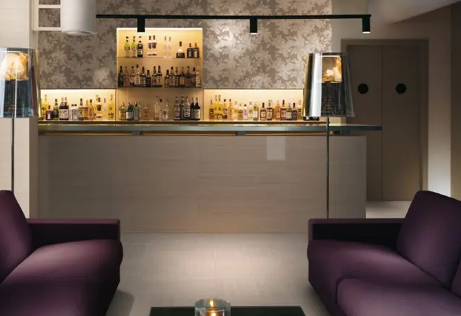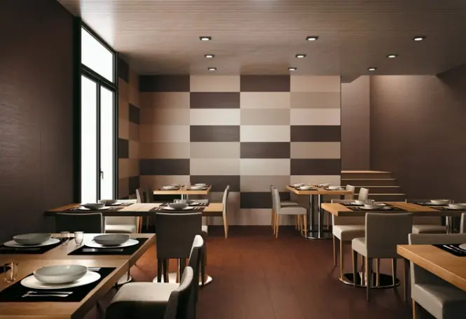 Model de gresie cu flise integrate si in decorul peretelui de la bar