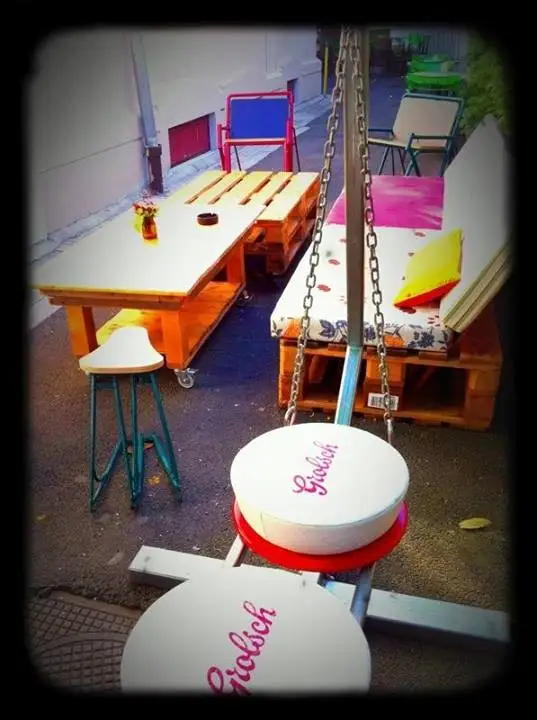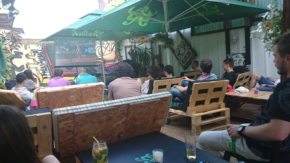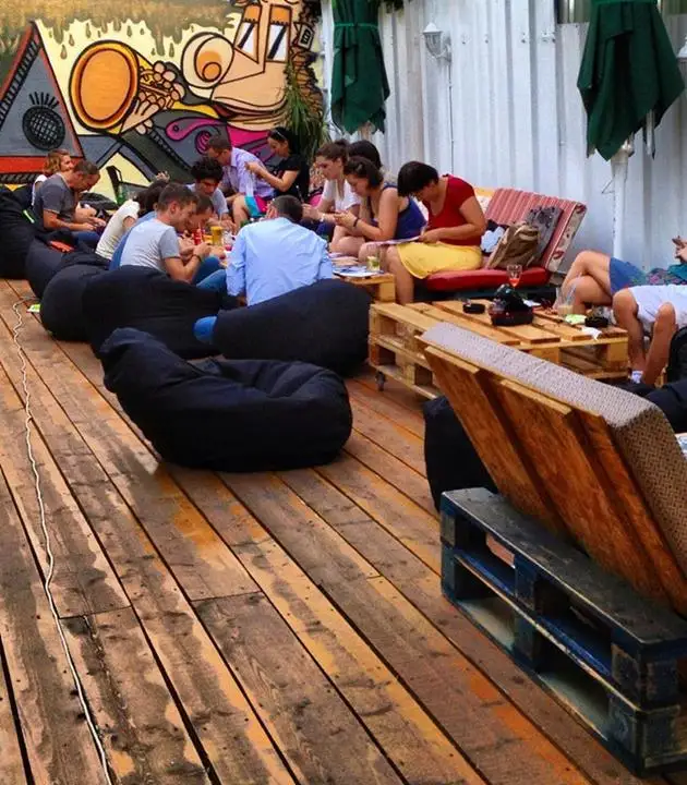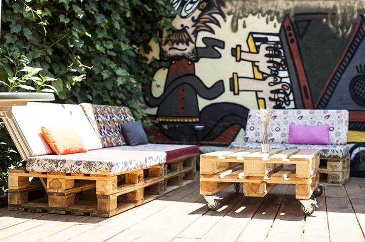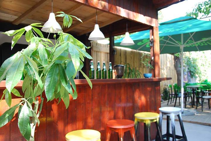 La exterior, terasa este imprejmuita de un gard inalt, tapetat cu usi vechi, pictate si prinse intr-un joc numai de ei stiut. Mobilierul de exterior este realizat dinpaleti din lemnsi perne decorative, scaune in forma de bicicleta, mese inalte si mese joase, un foisor din lemn pentru gastile mari de prieteni. Paharele in care esti servit nu sunt cele la care te-ai astepta.