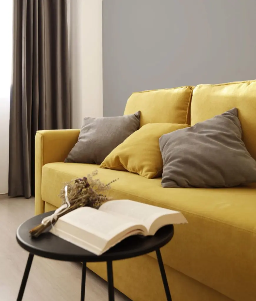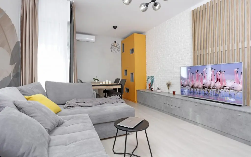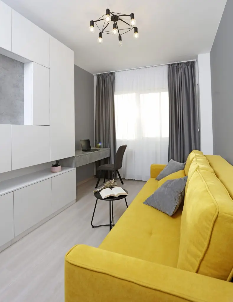 Deschide Galeria“Accentele de culoare sunt date de tapetul din spatele canapelei din living dar si de materialele textile cum ar fi canapeaua galbena din birou sau taburetul roz prafuit din dormitor. Galbenul si culoarea piersicii fiind vedetele.”- ne povestesc cei de la Cristian Patrascu Studio.