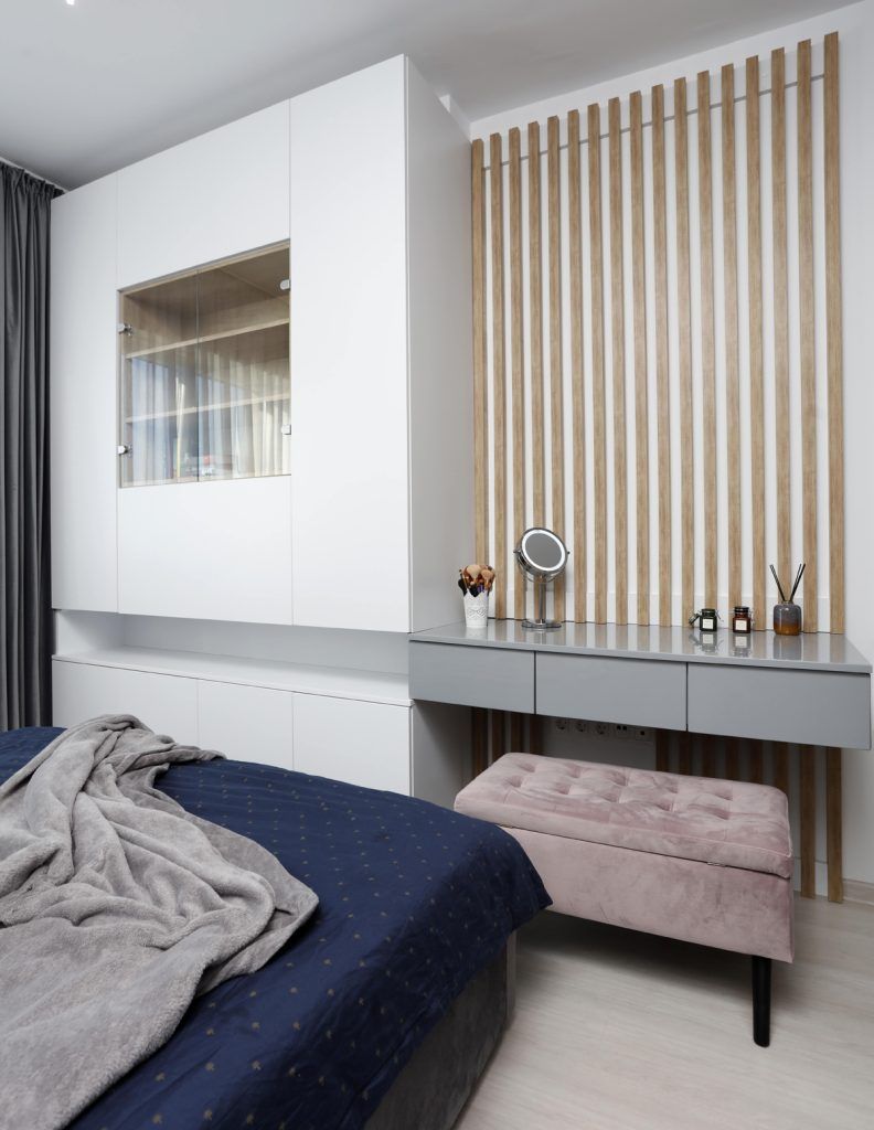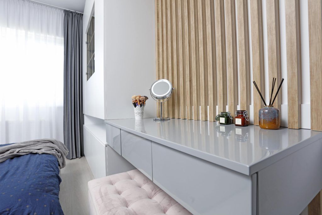 Beneficiarul nu si-a dorit televizor in dormitor; in schimb a fost integrata armonios o zona de make-up, pusa in valoare prin prezenta unor sipci de lemn. Depozitarea din fata patului mascheaza diferenta de plan a doi pereti.