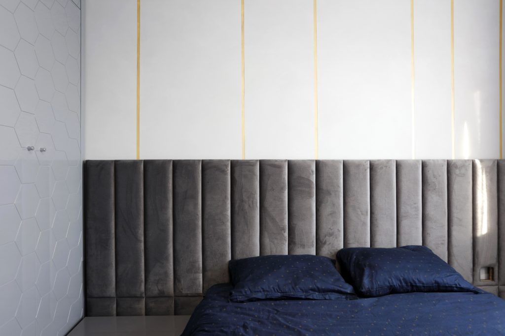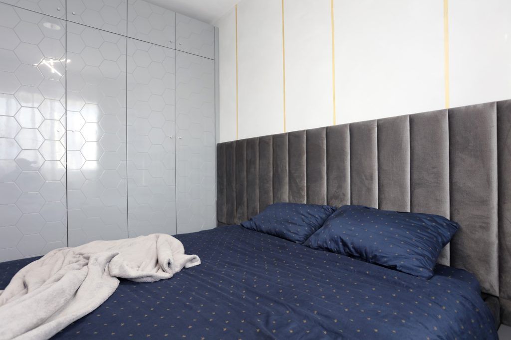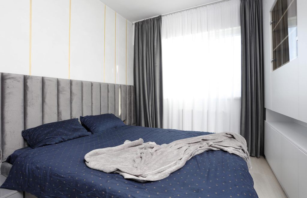 Amenajarea dormitorului si a camerei birou-dressing urmareste linia stilistica a locuintei si paleta cromatica in tonuri de gri. Catifeaua folosita la pat, tablia continua si draperii asigura confortul necesar. In birou a fost amplasata o canapea extensibila, extrem de practica, de la Bonami.