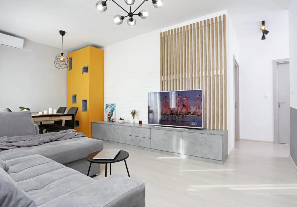 Peretele media din living a fost accentuat prin combinatia de materiale: caramida alba aparenta si un riflaj de lemn de stejar. Comoda simpla, liniara (realizata la comanda de A G Expert Mobila), pe care este amplasat televizorul are o textura placuta de beton aparent si se continua cu o zona de depozitare inalta adiacenta locului de luat masa.