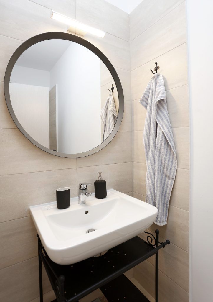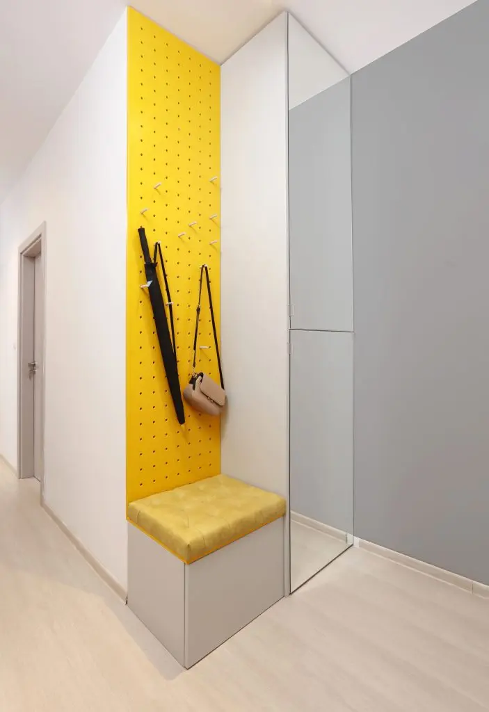 In hol, masina de spalat rufe si-a gasit o ascunzatoare perfecta intr-un corp de mobilier “dressing pentru oaspeti”. Usa cu oglinda mareste vizual spatiul; versatilitatea depozitarii este asigurata de zona de colt a mobilierului, cu o bancheta pentru a se incalta comod, pantofar dedesubt si agatatoare de haine deasupra.