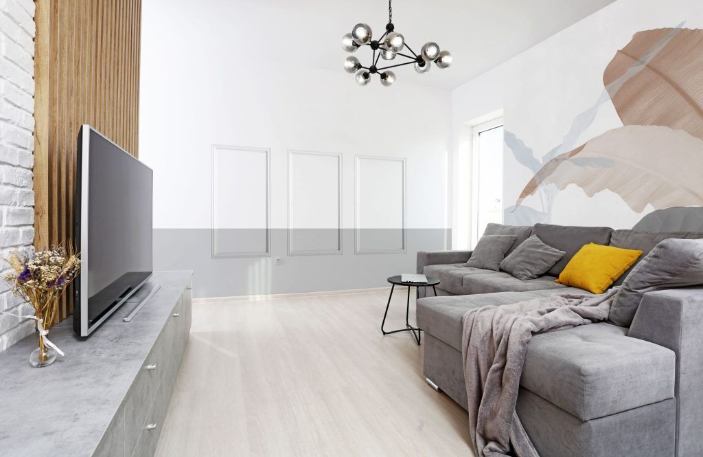 Fiecare perete din living a fost tratat diferit insa fara a concura intre ei, fiind armonizati in cadrul paletei cromatice neutre propuse de la inceput. Astfel, in spatele canapelei regasim un tapet, marca Rebel Walls, cu motive vegetale moderne. Peretele din zona de dining a fost finisat cu vopsea decorativa Premier Decor.