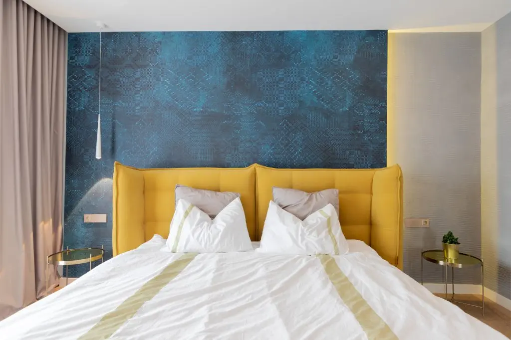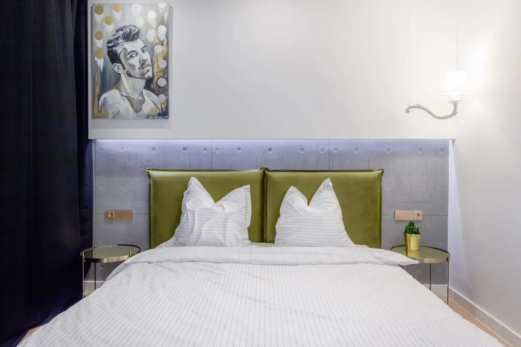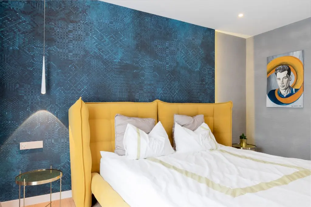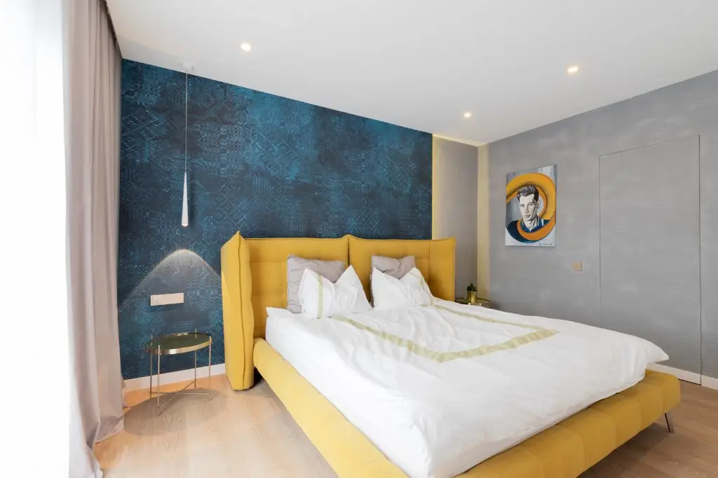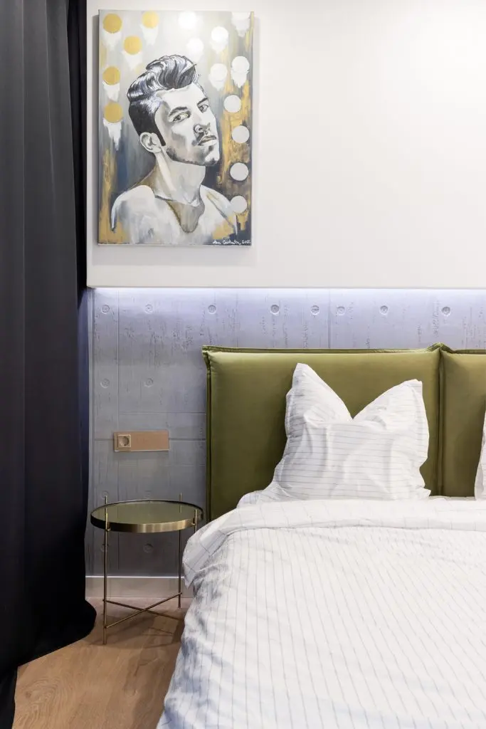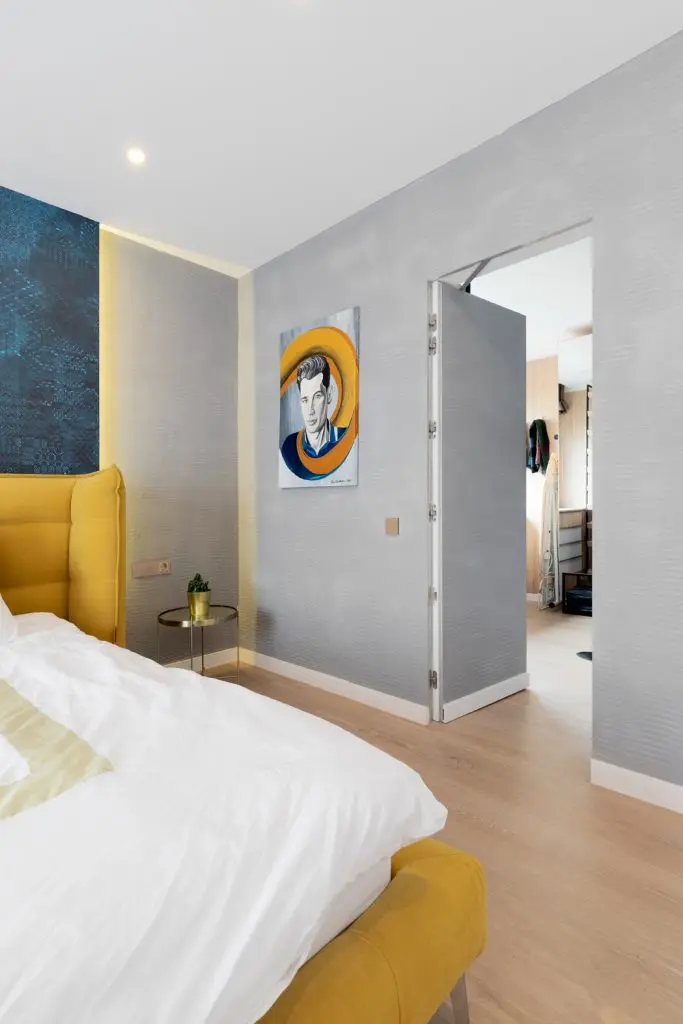 Cele doua dormitoare scot in evidenta stilurile diferite ale celor doi beneficiari. Vorbim in acest caz de un dormitor bazat pe culori reci, accente elegante si artistice si un altul plin de culori calde. In cazul ambelor dormitoare se opteaza pentru efecte de lumina date de benzile de led incastrate. In cazul celui de al doilea dormitor, patul pare a fi o componenta modulara, tablia acestuia fiind alcatuita din doua saltele ce pot fi utilizate ca doua canapele joase.