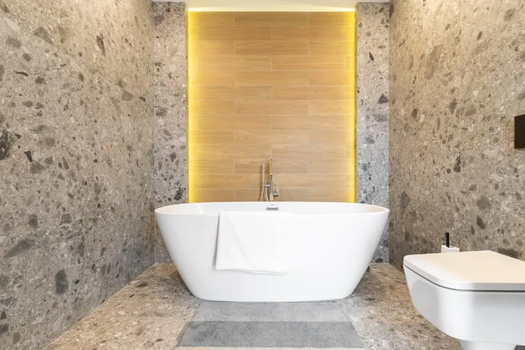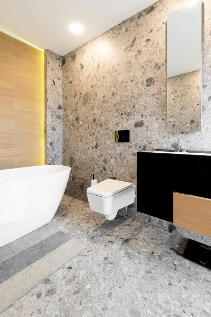 Baia principala se infatiseaza sub forma unui cadru relaxant, desprins din centrele de wellness si spa moderne. In cazul peretilor se opteaza pentru granit si lemn natural, la care se adauga oglinda si efecte de muschi natural. Mobilierul este extrem de minimalist si se completeaza perfect cu corpurile sanitare moderne. In ceea ce priveste corpurile de iluminat, observam doua stiluri opuse: benzi de led incastrate si globuri din sticla cu aspect pretios.