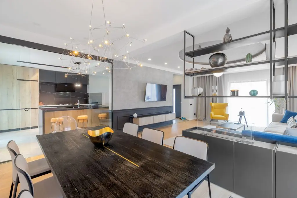Trecerea catre living se face prin zona de dining unde se pozitioneaza o masa supradimensionata cu aspect de lemn natural si, pentru ca linia simpla a componentelor de mobilier trebuie sa fie evidentiata, punctulde atractie il constituie lustra abstracta cu detalii fine.