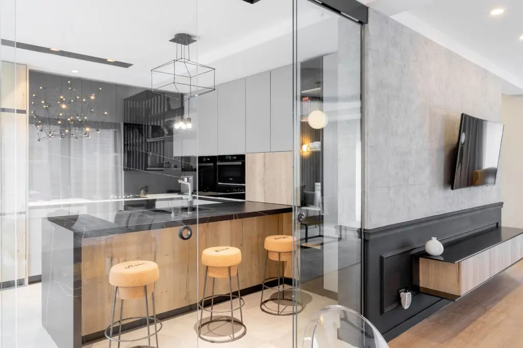 In cazul celor trei zone corespondente: bucatarie, dining si living, optarea pentru pereti despartitori din sticla face posibila conturarea unui open space de mari dimensiuni care permite in acelasi timp izolarea spatiului destinat proceselor de gatire, impiedicand astfel transferul aburului, fumului sau mirosurilor in celelalte spatii ale locuintei.