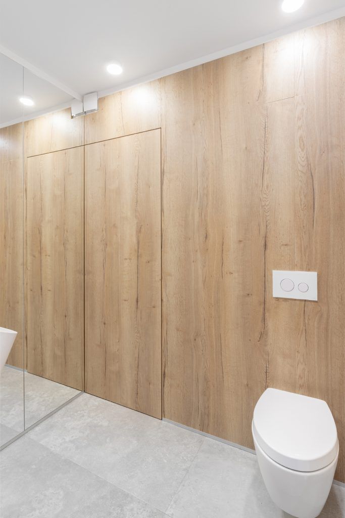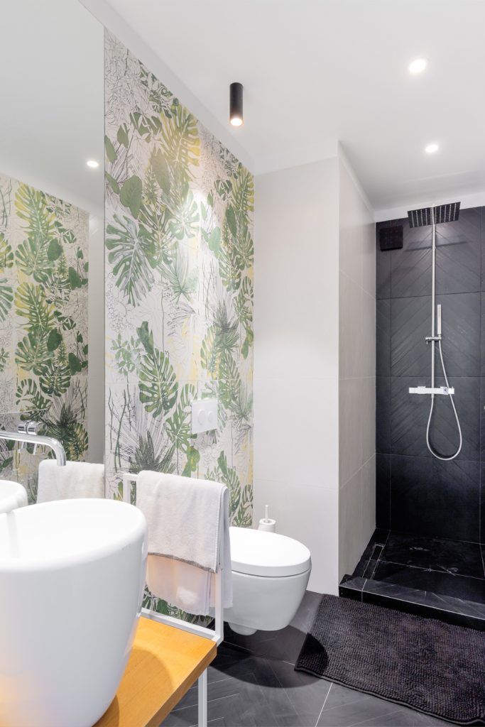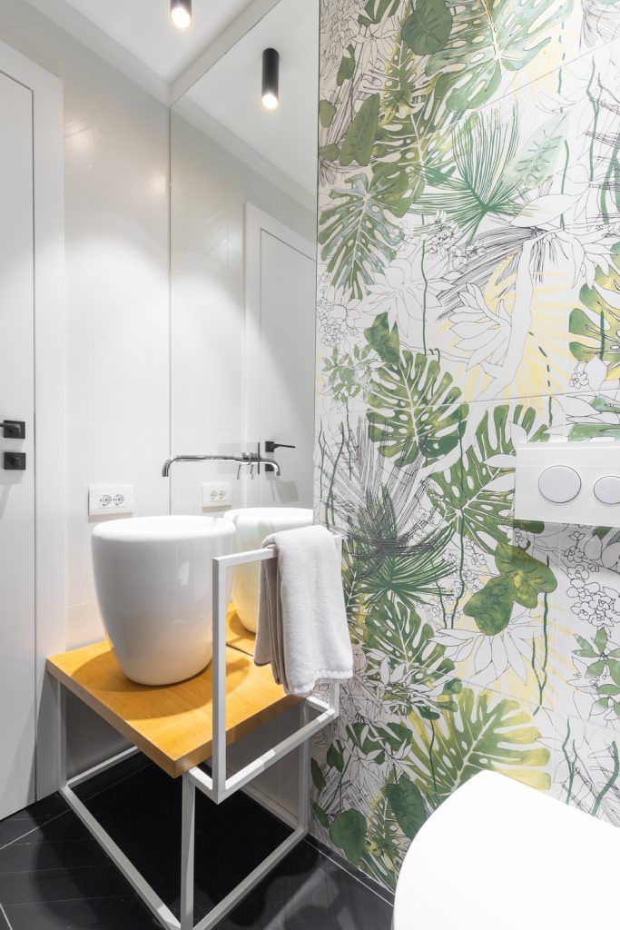 Cea de a doua baie urmeaza aceeasi linie, adaugand insa mai multe elemente cu aspect natural: un intreg perete din lemn si un tapet cu design tropical. Remarcat se face insa lavoarul, al carui design adauga un plus de futurism intregii camere si care se reflecta intr-un perete din oglinda pozitionat lateral si nu in spatele sau, cum suntem obisnuiti.