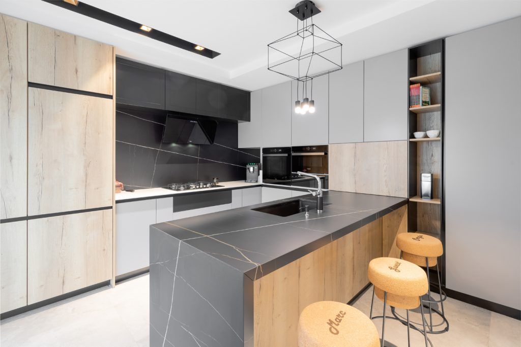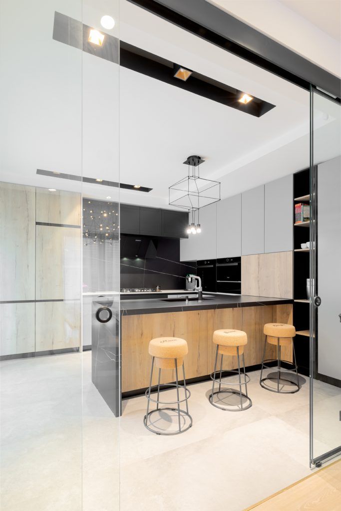 Mobilierul bucatariei este unul minimalist, lipsit de decoratiuni si chiar manere, cu o coloristica bazata pe nuante inchise si de lemn natural. La acesta se adauga trei scaune nonconformiste ce ilustreaza fidel design-ul dopurilor sticlelor de sampanie si o lustra abstracta cu aspect geometric.