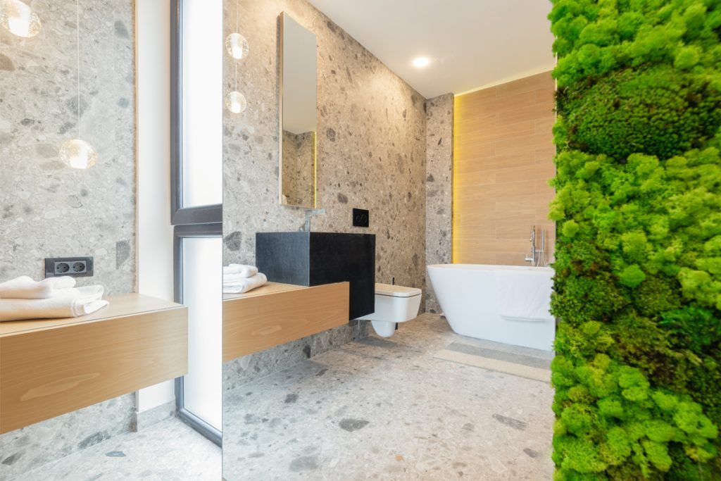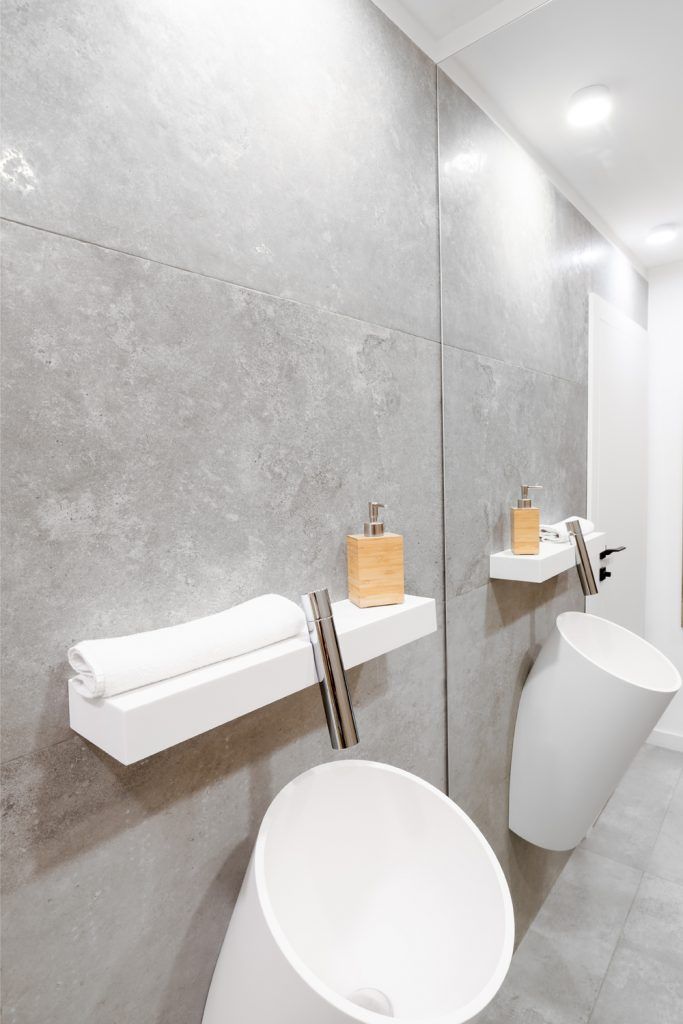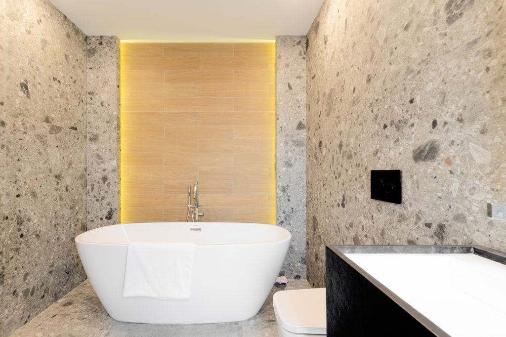 Baia principala se infatiseaza sub forma unui cadru relaxant, desprins din centrele de wellness si spa moderne. In cazul peretilor se opteaza pentru granit si lemn natural, la care se adauga oglinda si efecte de muschi natural. Mobilierul este extrem de minimalist si se completeaza perfect cu corpurile sanitare moderne. In ceea ce priveste corpurile de iluminat, observam doua stiluri opuse: benzi de led incastrate si globuri din sticla cu aspect pretios.