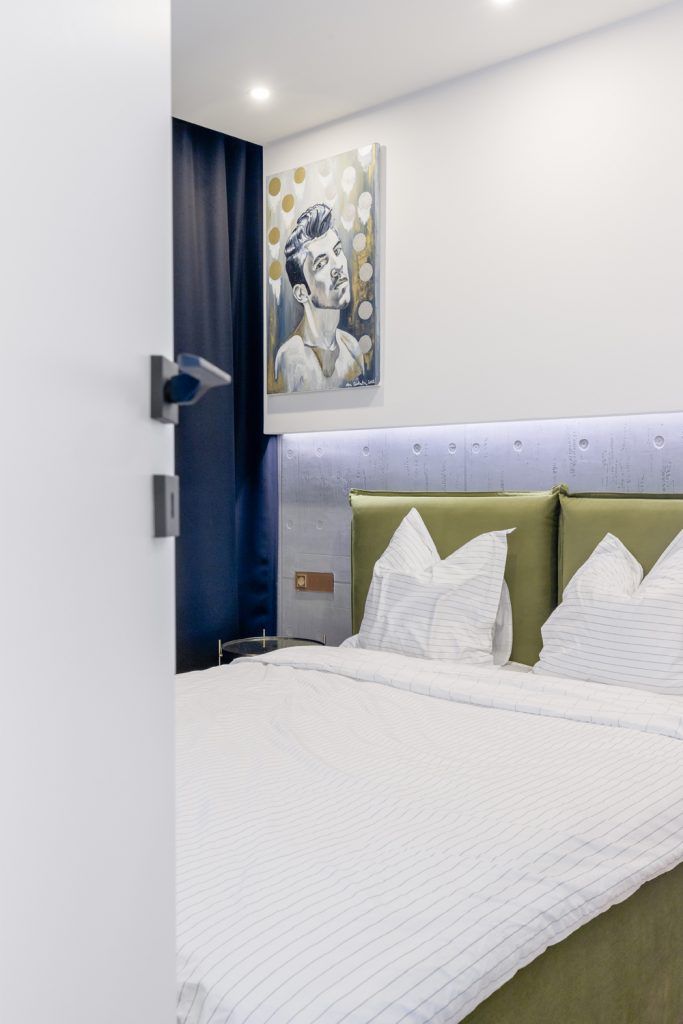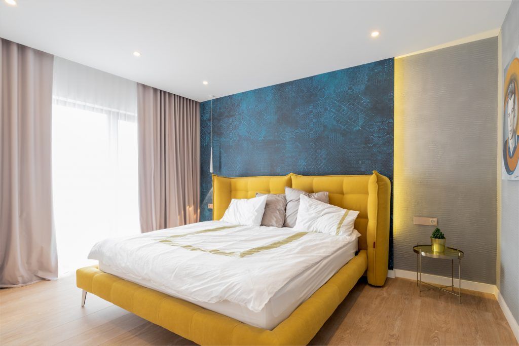 Cele doua dormitoare scot in evidenta stilurile diferite ale celor doi beneficiari. Vorbim in acest caz de un dormitor bazat pe culori reci, accente elegante si artistice si un altul plin de culori calde. In cazul ambelor dormitoare se opteaza pentru efecte de lumina date de benzile de led incastrate. In cazul celui de al doilea dormitor, patul pare a fi o componenta modulara, tablia acestuia fiind alcatuita din doua saltele ce pot fi utilizate ca doua canapele joase.