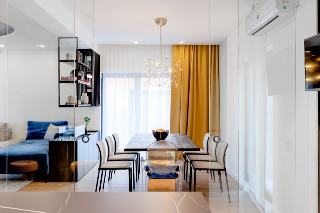 In cazul celor trei zone corespondente: bucatarie, dining si living, optarea pentru pereti despartitori din sticla face posibila conturarea unui open space de mari dimensiuni care permite in acelasi timp izolarea spatiului destinat proceselor de gatire, impiedicand astfel transferul aburului, fumului sau mirosurilor in celelalte spatii ale locuintei.