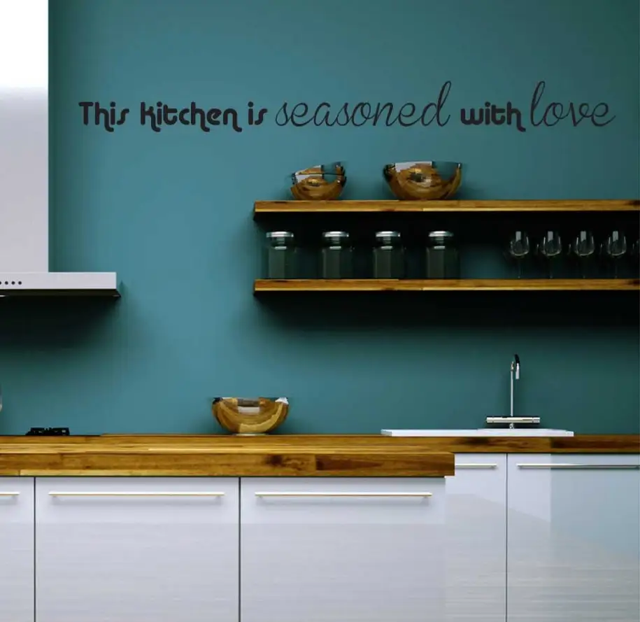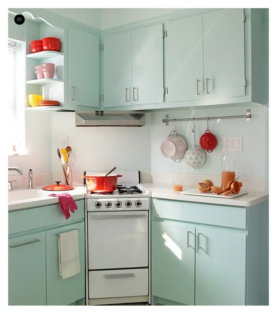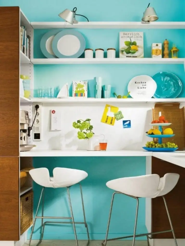 Un perete accent vopsit in turcoaz schimba rapid ambientul monoton al unei bucatarii.