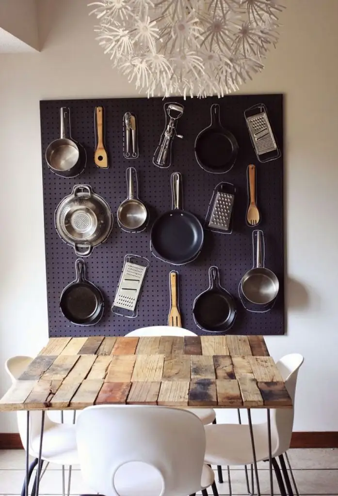 Alegerea unor solutii pentru depozitare la vedere este o alta maniera de a schimba aspectul incaperii. Va puteti pastra cele mai folosite ustensile de bucatarie la indemana, agatandu-le deasupra blatului de lucru sau suspendandu-le de tavan.