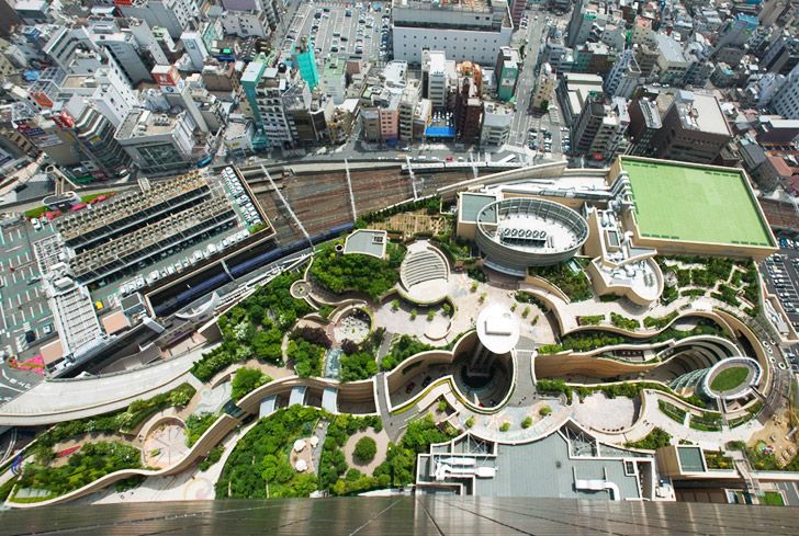 Vedere de ansamblu asupra mall-ului si a celor 8 gradini construite pe 8 etaje diferite ale Namba Parks din Japonia