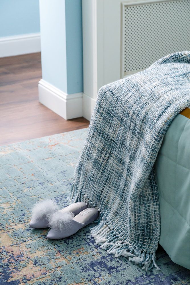 Dormitorul matrimonial este amenajat ca o continuare a livingului, mentinand aceeasi linie stilistica. Regasim acelasi tip de parchet din lemn masiv si jocul de tonalitati de albastru, de la nuantele deschise ale peretilor si covorului la cele mai saturate ale obiectelor de decor. Caloriferul a fost ascuns cu o masca de calorifer cu trafor clasic, vopsit in aceeasi nuanta de alb a plintei.