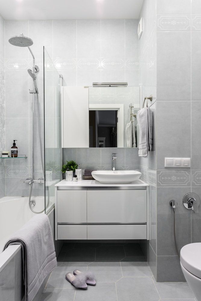 Neutra din punct de vedere cromatic, cu finisaje in nuante de griuri calde, baia este un spatiu armonios, elegant, amenajata modern. Atentia este atrasa de gresia cu un colt tesit la 45 de grade care creeaza un pattern iesit din tipare. Acest detaliu interesant este dublat de braul decorativ discret.