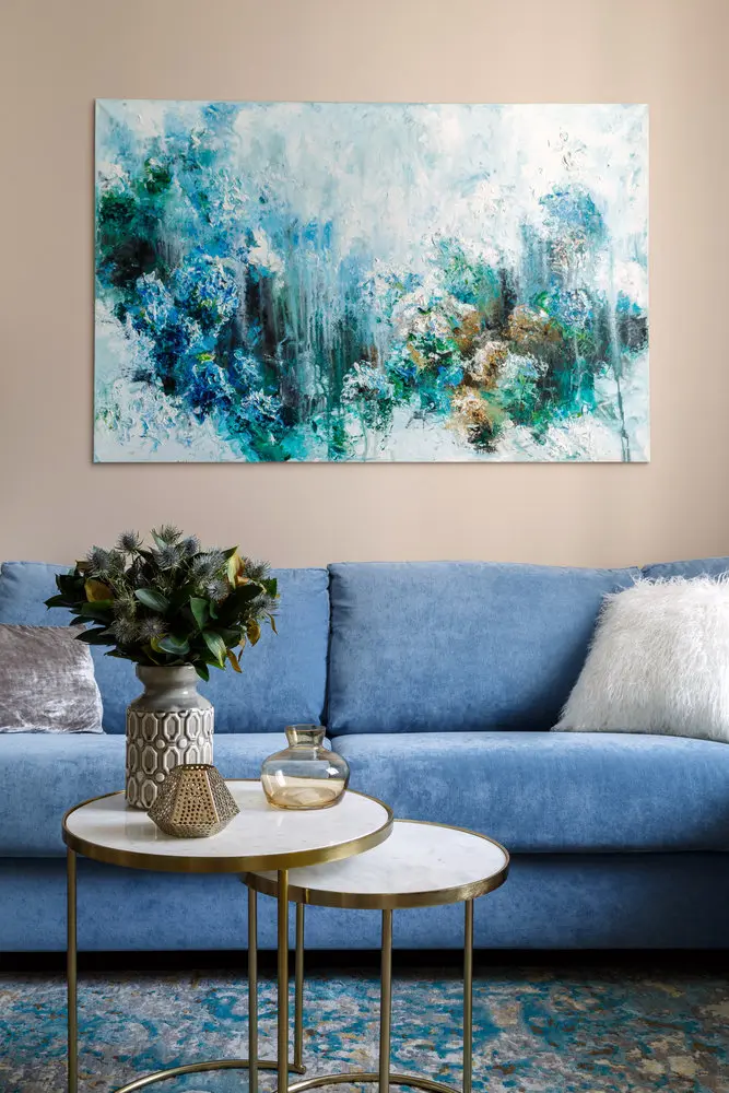 Livingul transmite o atmosfera calda, primitoare, un spatiu dedicat relaxarii in familie. Accentul a fost pus pe confort si crearea unei circulatii optime. Regasim combinatia de culori calde cu cele reci, reprezentate de nuante placute de albastru; predomina albul mat al plafonului si nuanta de crem satinat a peretilor, puse in evidenta de albastrul intens al canapelei de colt.