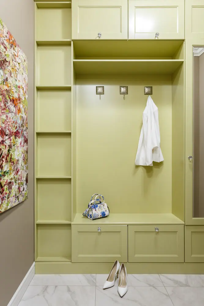 Piesa cea mai importanta din amenajarea holului o constituie dulapul incastrat, din mdf vopsit intr-o nuanta placuta de verde praz. Nisa existenta a permis exploatarea spatiului din hol, generand rafturi si sertare generoase de depozitare, mobilierul avand integrata si o oglinda bizotata.