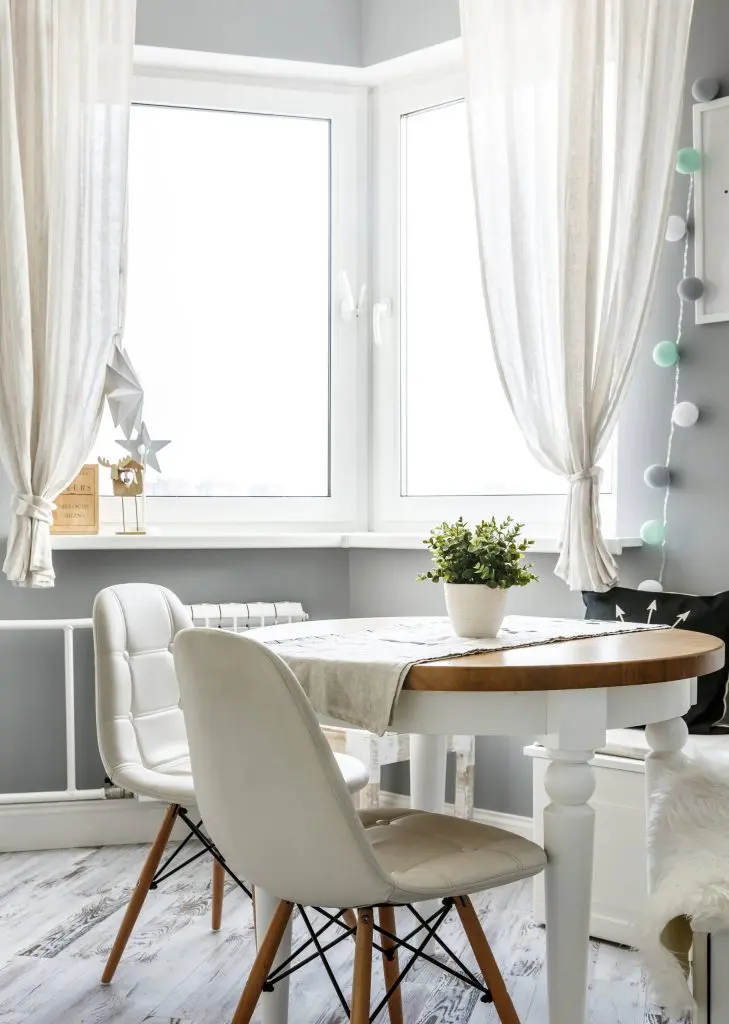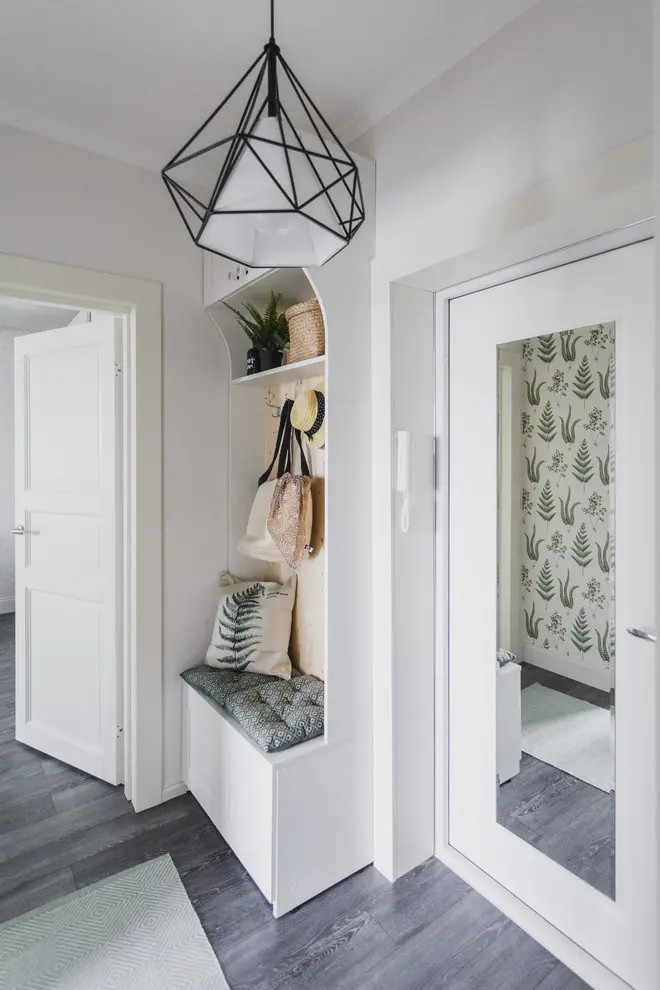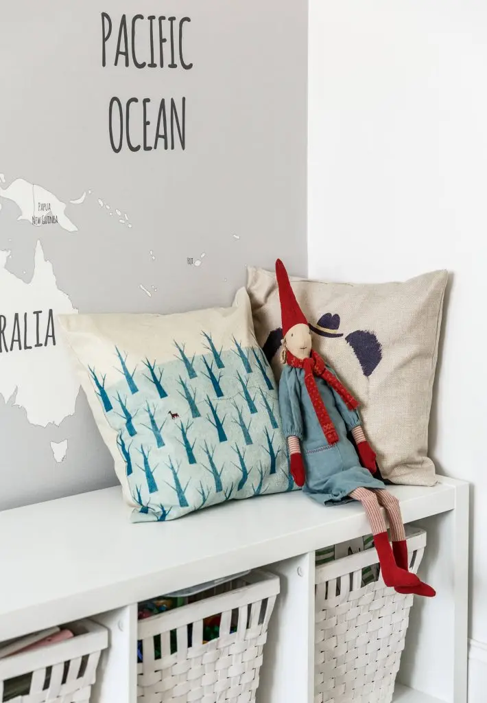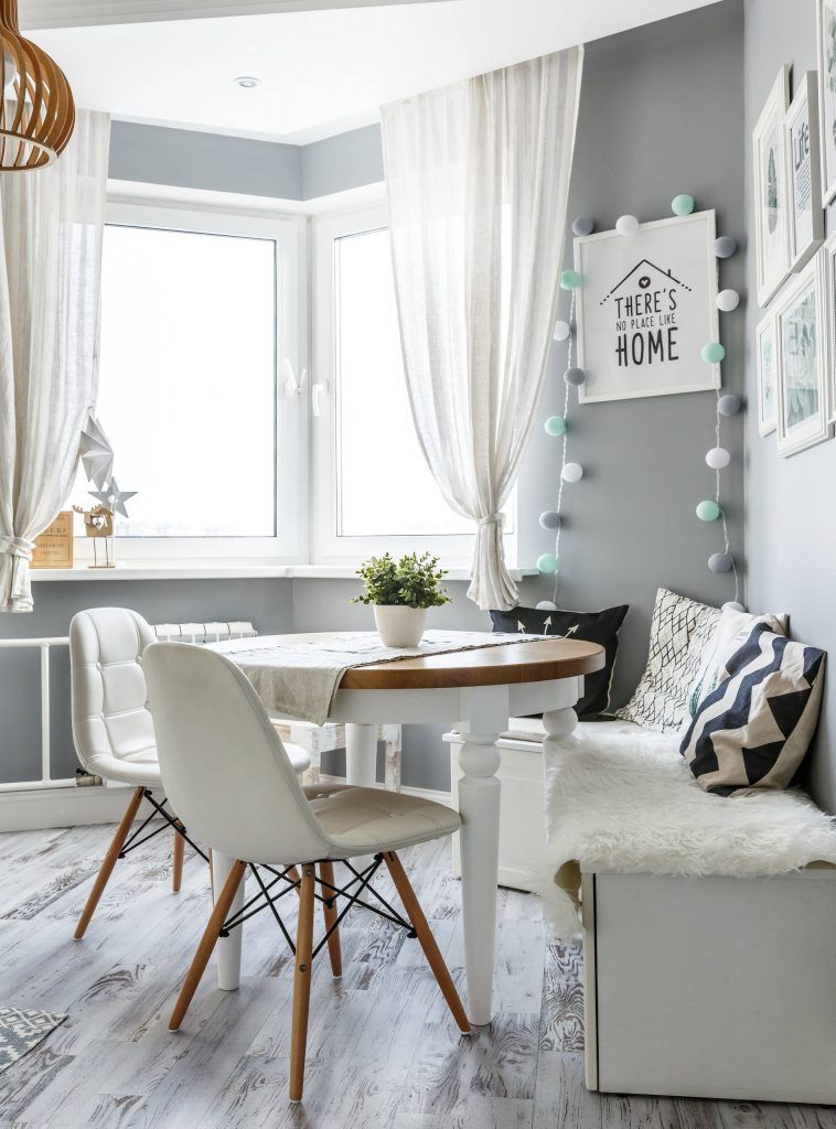 Bancheta de colt, pliata pe forma peretilor, a fost confectionata de fratele Taniei. Spatiul de depozitare de sub sezut este foarte util. Decoratiunile care intregesc acest colt in nuante pastelate amintesc de interioarele scandinave.