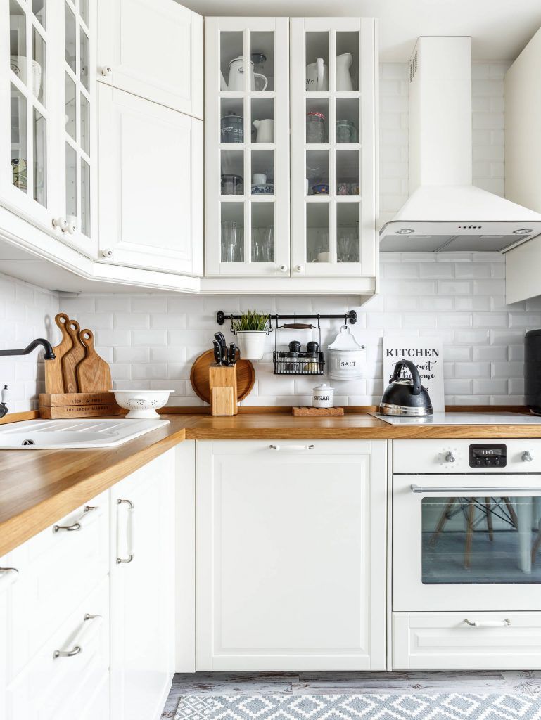 Bucataria este camera de unde a inceput reamenjarea si astfel a dat tonul stilistic si cromatic al intregului decor. Neavand plita sau cuptor pe gaz, au decis sa nu monteze usa la intrarea in bucatarie, lasand doar un cadru clasic alb, in contrast cu peretii vopsiti intr-o nuanta calda de gri.