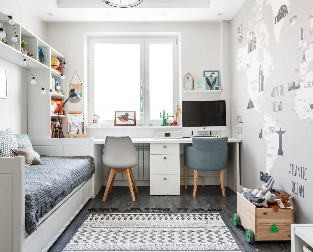 Spatiul din balcon, cu o forma mai putin comuna, a fost valorificat prin amenajarea unui mic birou pentru Alex pe latura mai generoasa si un spatiu de depozitare in partea opusa. Tania isi imparte biroul cu fiul ei in camera copiilor.