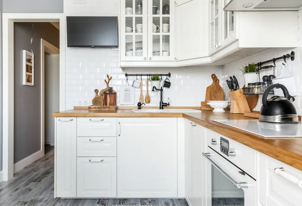Tavanul cu nisa cu spoturi incastrate din bucatarie a fost si el pastrat, fiind inlocuite doar becurile vechi, cu unele cu Led. Nu au scos gresia pe care au gasit-o in bucatarie cand s-au mutat ci au ales sa monteze direct peste ea panouri din pluta de 1 centimetru grosime , de la Corkstyle. Aceasta optiune asigura un impact vizual placut si confortul dorit, copiii putand sa mearga desculti pe pardoseala.