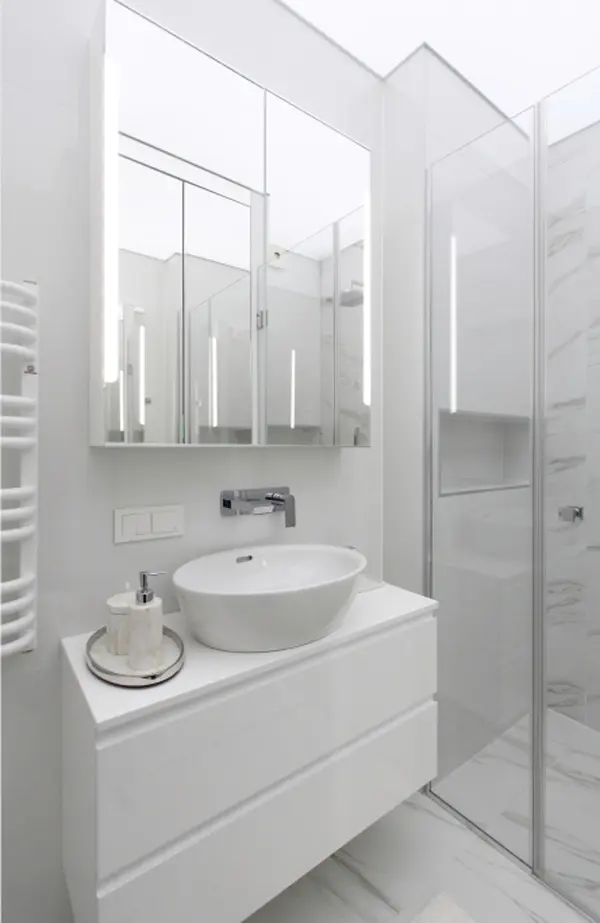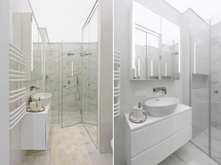 Dormitorul este simplu si elegant in acelasi timp. Cu un pat pozitionat central si un perete invelit intr-un tapet cu motive geometrice minimaliste, acesta lasa sa iasa in evidenta 2 componente: un tablou asemanator cu cel regasit in living si pernele colorate intr-un galben mustar si linistitor.Baia se prezinta intr-un mod ultra modern prin cantitatea impresionanta de alb regasit mural si in mobilier si prin sticla si oglinzile care ajuta la cresterea vizuala a dimensiunii acestei incaperi.