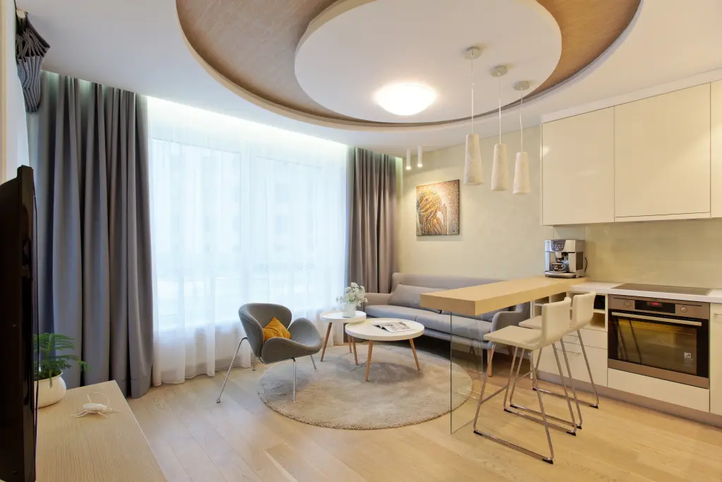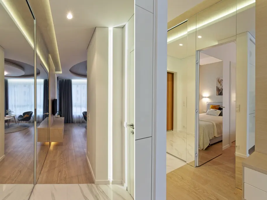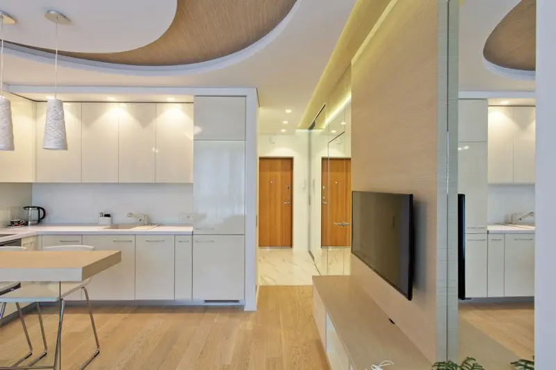 Intrarea in apartament se face discret printr-un hol evidentiat si marit vizual de catre un perete din oglinzi, perete ce ascunde zona dormitorului. Si ce poate sa fie mai modern si mai secretos in acelasi timp decat o usa mare din oglinda?Trecerea catre living se face prin bucatarie. Cele doua incaperi formeaza impreuna un spatiu deschis destinat relaxarii si servirii mesei. Mobilierul este simplu, in nuante de ulm si bej lucios. Prezenta subtila a lemnului din parchet si mobilier se face simtita de aceasta data intr-un mod geometric si nonconformist, sub forma unei scafe pe tavan.