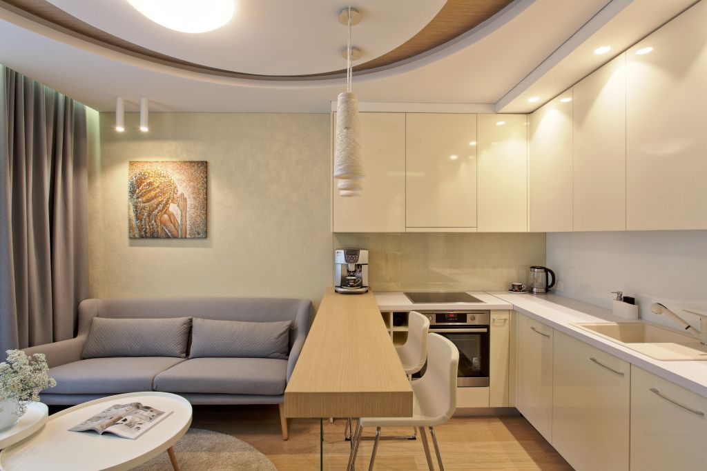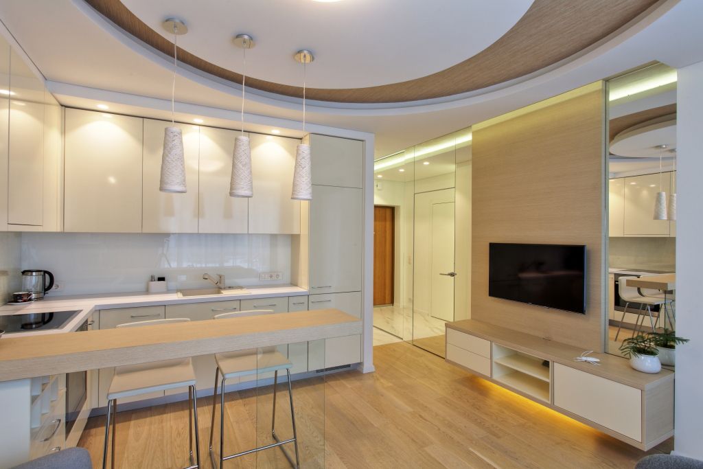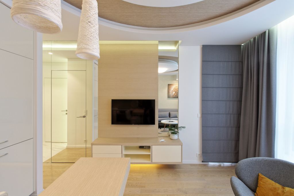 Intrarea in apartament se face discret printr-un hol evidentiat si marit vizual de catre un perete din oglinzi, perete ce ascunde zona dormitorului. Si ce poate sa fie mai modern si mai secretos in acelasi timp decat o usa mare din oglinda?Trecerea catre living se face prin bucatarie. Cele doua incaperi formeaza impreuna un spatiu deschis destinat relaxarii si servirii mesei. Mobilierul este simplu, in nuante de ulm si bej lucios. Prezenta subtila a lemnului din parchet si mobilier se face simtita de aceasta data intr-un mod geometric si nonconformist, sub forma unei scafe pe tavan.