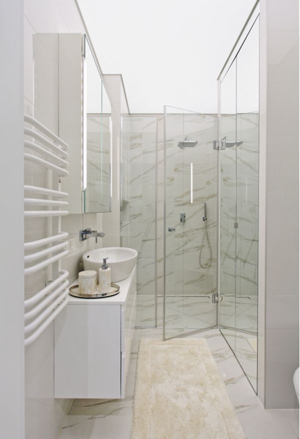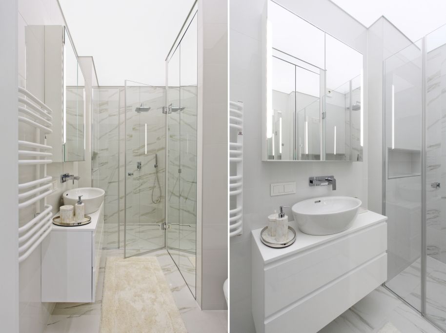 Dormitorul este simplu si elegant in acelasi timp. Cu un pat pozitionat central si un perete invelit intr-un tapet cu motive geometrice minimaliste, acesta lasa sa iasa in evidenta 2 componente: un tablou asemanator cu cel regasit in living si pernele colorate intr-un galben mustar si linistitor.Baia se prezinta intr-un mod ultra modern prin cantitatea impresionanta de alb regasit mural si in mobilier si prin sticla si oglinzile care ajuta la cresterea vizuala a dimensiunii acestei incaperi.