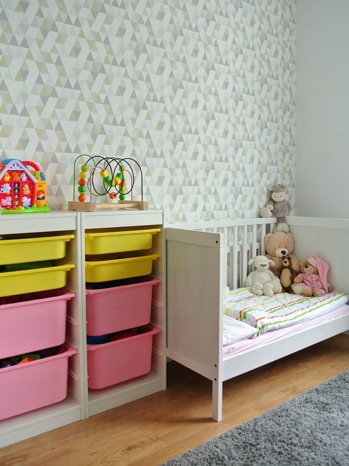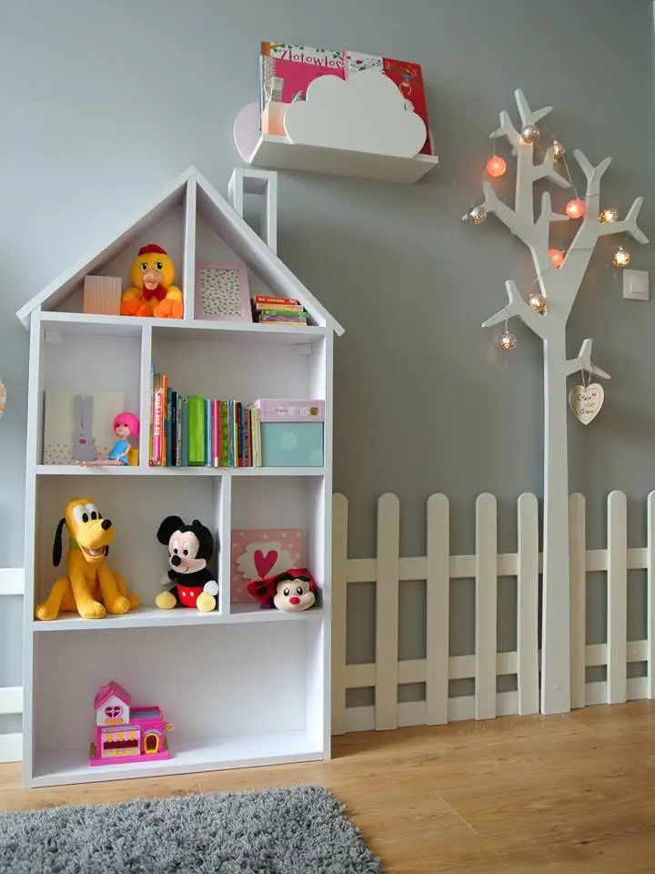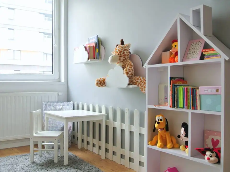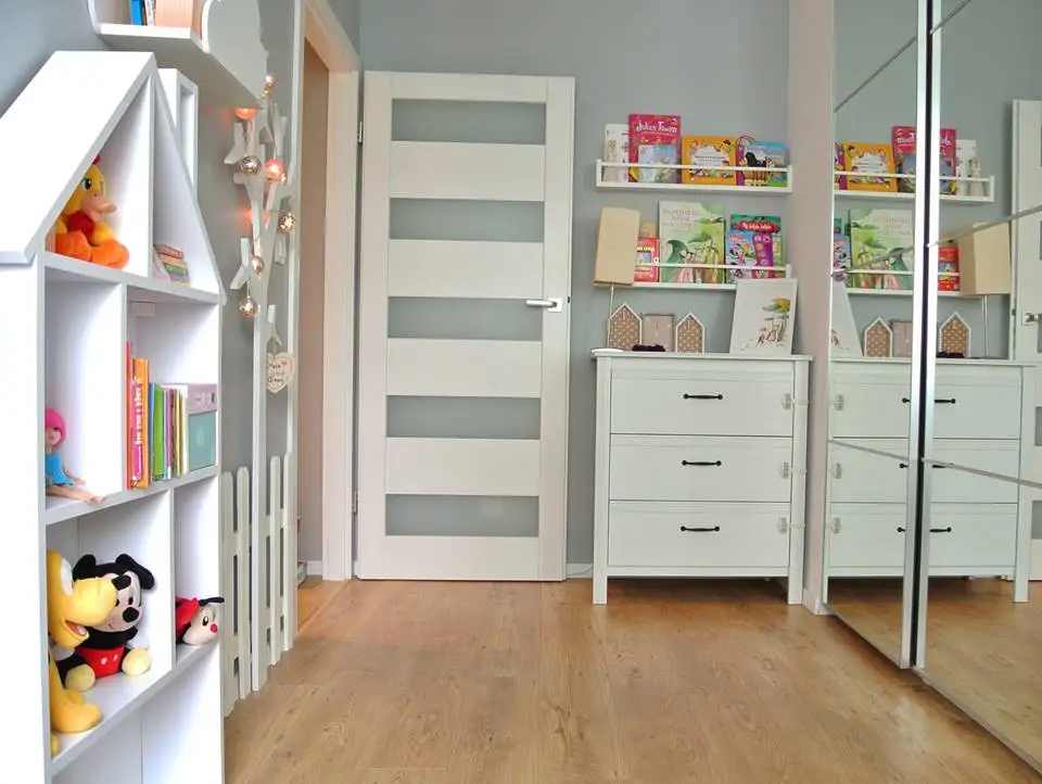 Camera copilului ne introduce intr-o lume ludica, cu imprimeuri si culori vesele, dar si mobilier ce imita corpuri de casute, norisori sau gard. Latura pragmatica e vizibila si aici printr-un dulap generos cu usi glisante, si ele acoperite cu oglinzi.