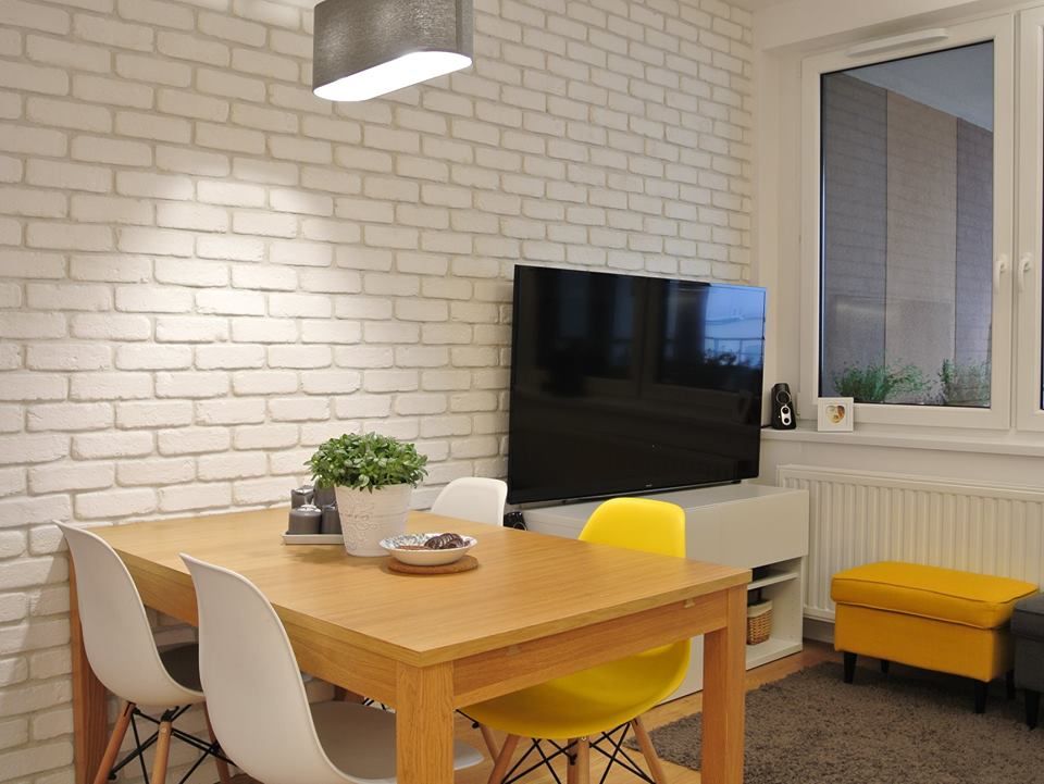 Pentru a marca zona de luat masa, Justyna a mizat pe o placare cu caramida aparenta. Astfel, cu un plus de textura si cu un corp de iluminat suspendat a reusit sa contureze un loc placut in cadrul amenajarii.