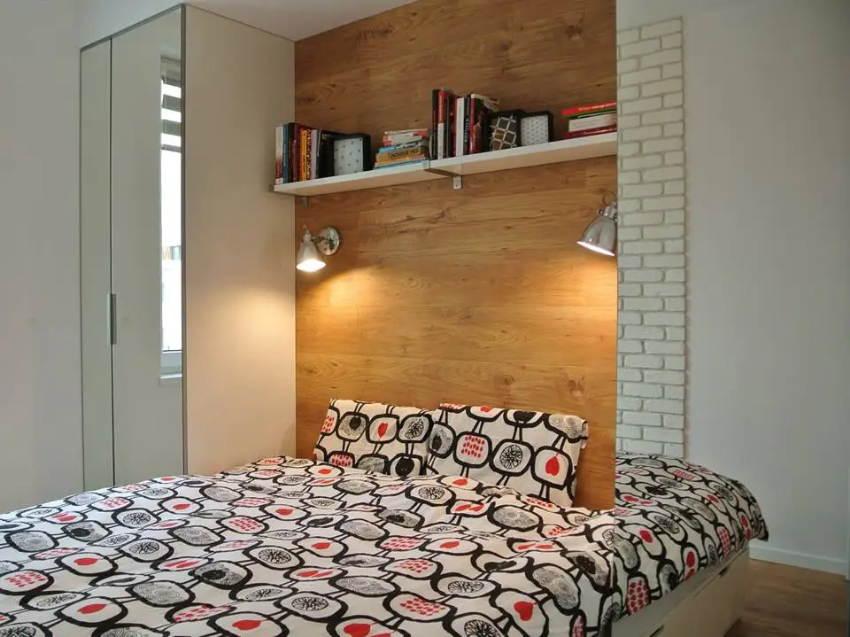 In dormitorul matrimonial s-a optat pentru un design functional, cu dulapuri de haine dispuse simetric de o parte si cealalta a paturilor. In plus, usile cu oglinzi creeaza impresia de profunzime si largire a spatiului, un truc minunat pentru spatiile mici. Placarea zonei patului scoate in evidenta aceasta parte incadrata de depozitare.