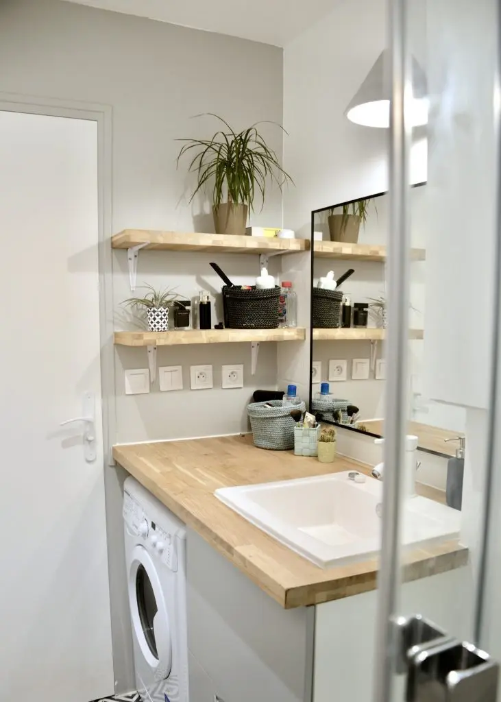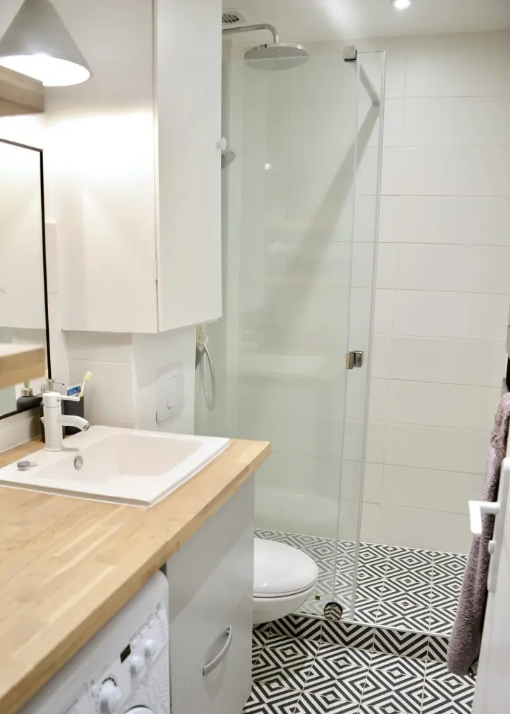 In baie, spatiul a fost optimizat pentru a integra si masina de spalat rufe si o zona de dus, intre cele doua fiind pozitionat vasul de toaleta. Corpul realizat pe comanda include lavoarul, un blat si un mic dulap pozitionat langa masina. Placile ceramice cu motiv geometric distrag atentia de la dimensiunile incaperii si aduc un plus de dinamism decorului.