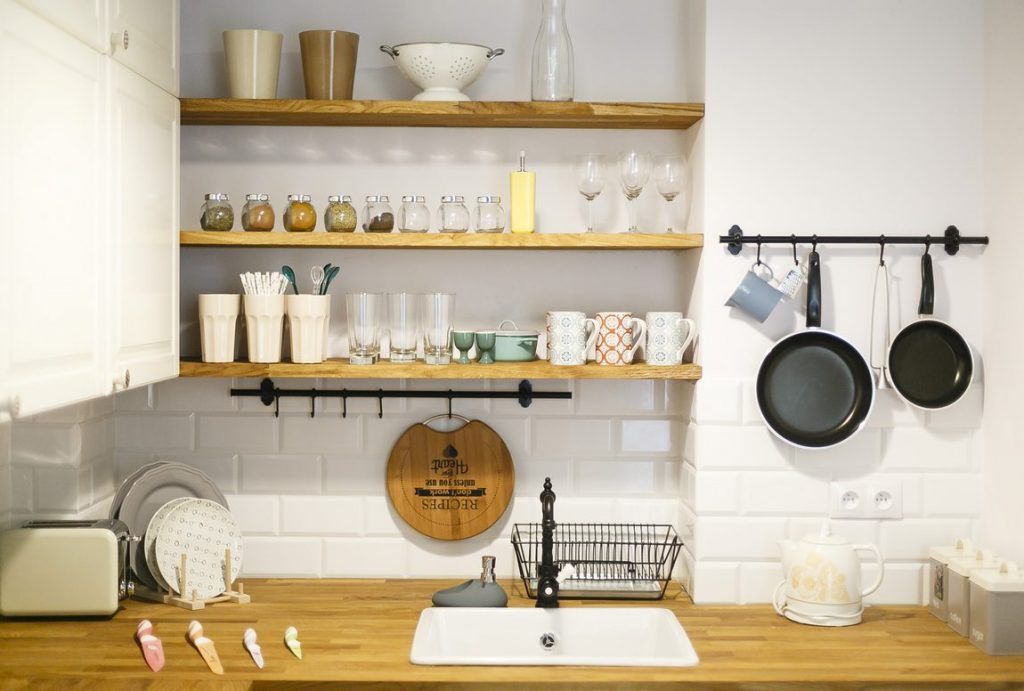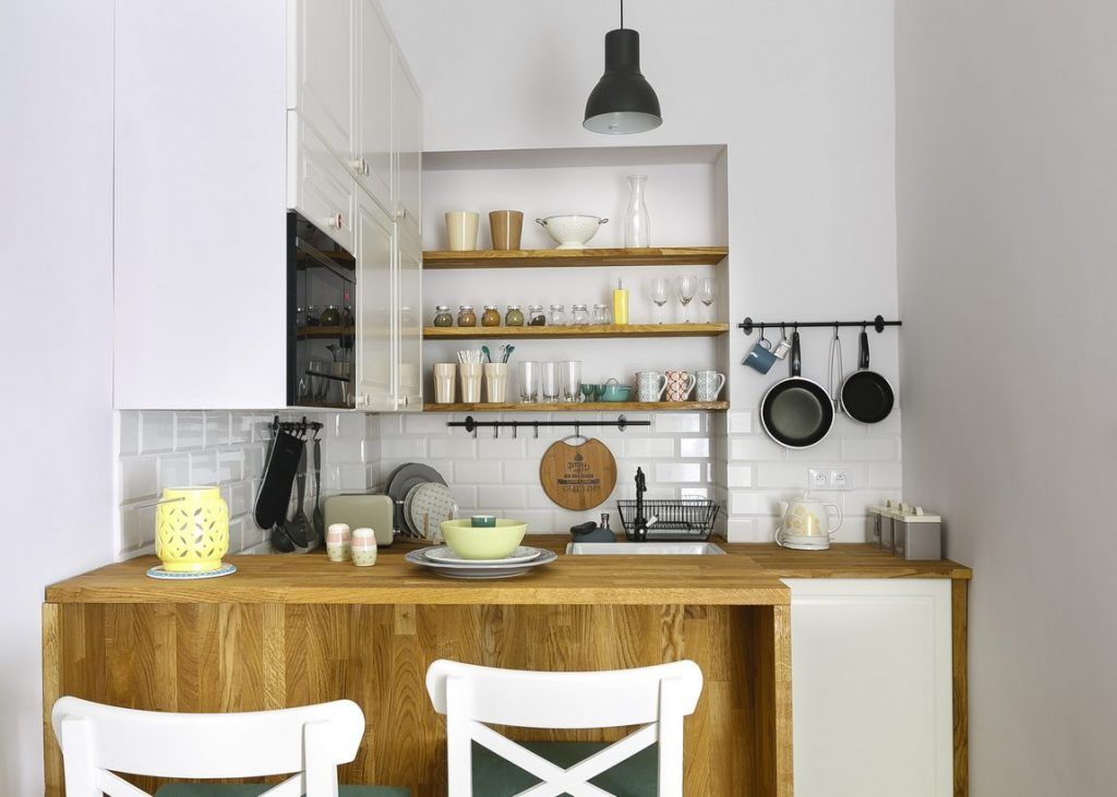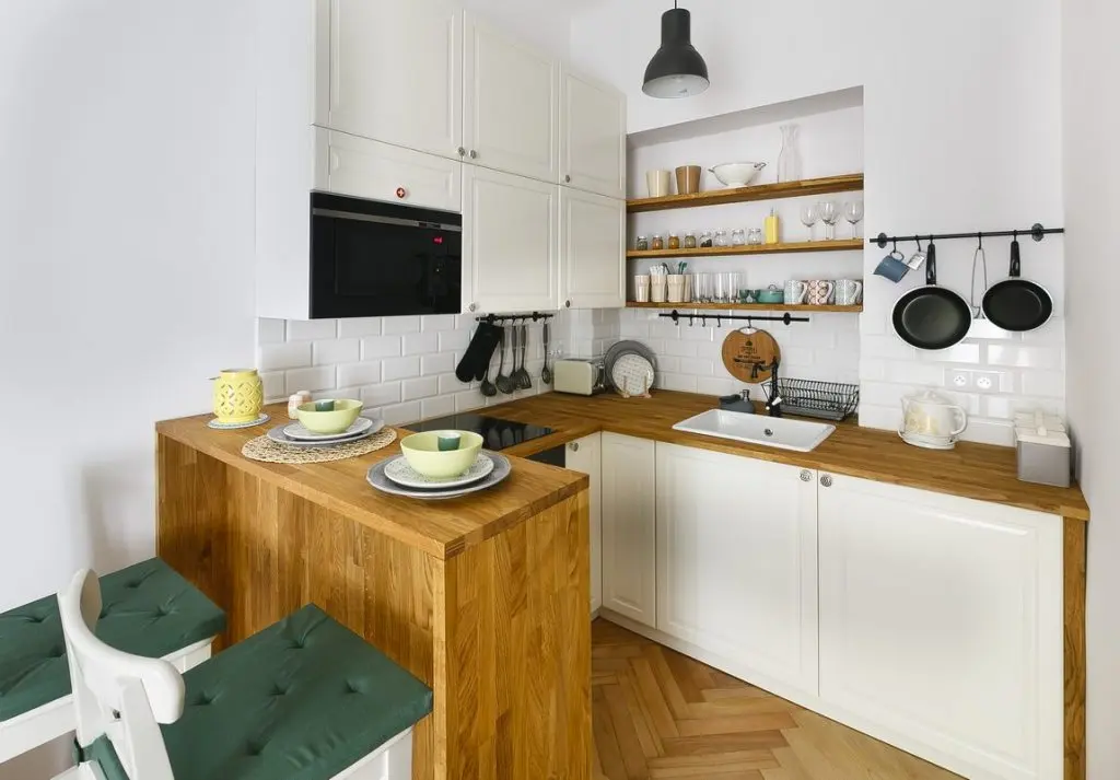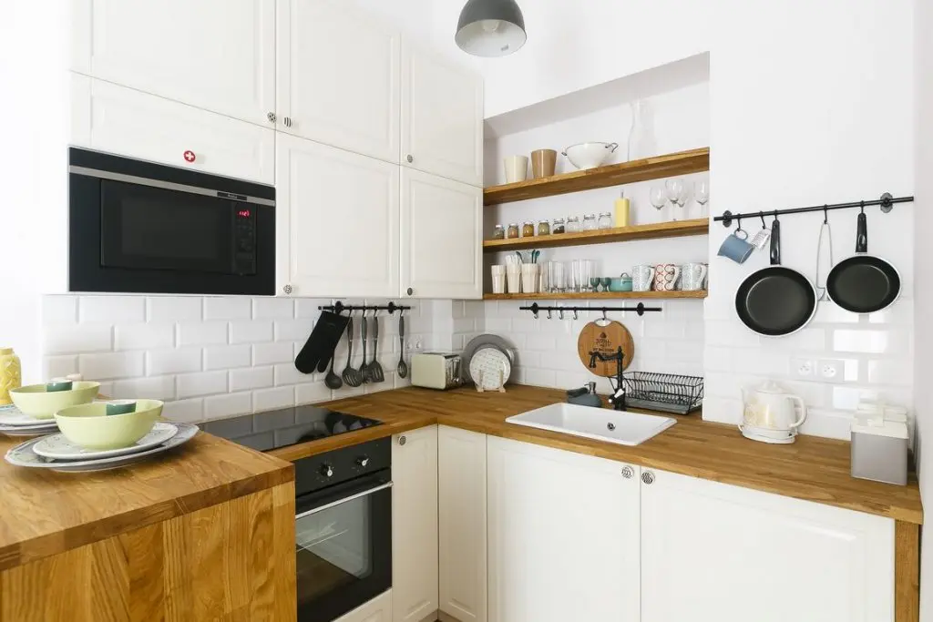 Dulapurile suspendate si nisa in care au fost incorporate cateva polite din lemn ofera posibilitatea unei depozitari extinse si a incastrarii electrocasnicelor, cum ar fi cuptorul cu microunde. Excelenta combinatia dintre albul fronturilor si lemnul utilizat pentru blat si etajere, lasand o senzatie placuta de caldura.