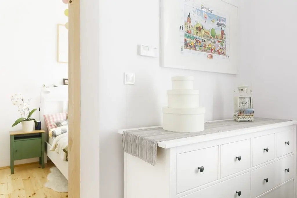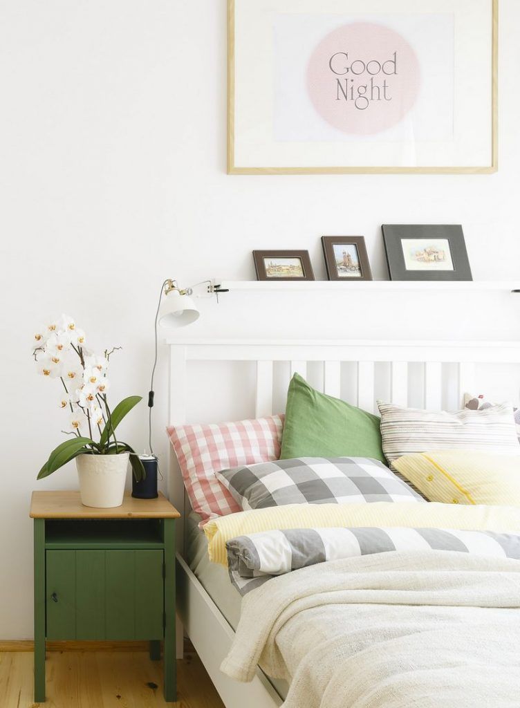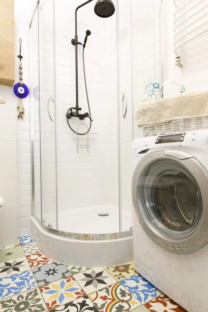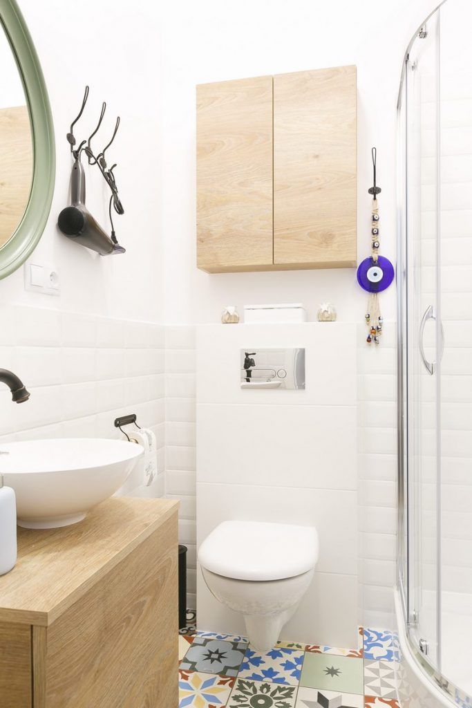 In dormitor s-a mizat pe aceeasi abordare minimalista, accentele de culoare si decoratiunile fiind cele care confera un aer vesel si relaxant incaperii. In acelasi spirit a fost amenajata si baia, placile decorative in stil patchwork ies in evidenta pe fundalul unui alb predominant.