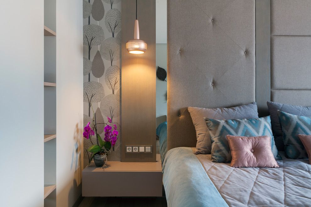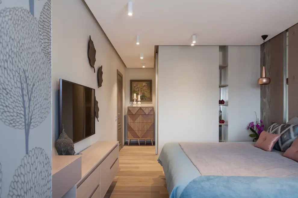 Dormitorul matrimonial este unul cu o suprafata confortabila intrucat a permis amenajarea unui dressing tip walk-in precum si a unui spatiu de lucru. Decorul preia din tematica dezvoltata in living printr-un tapet cu motiv vegetal si a unor culori inspirate de natura. Tablia tapitata confera un plus de confort, iar noptierele suspendate lasa impresia de mai mult spatiu la nivelul pardoselii.